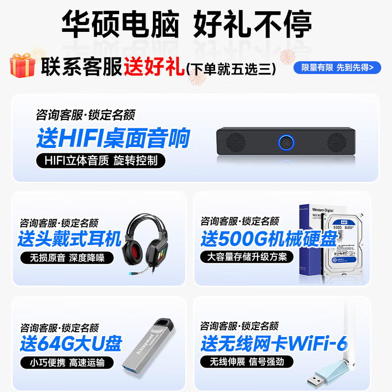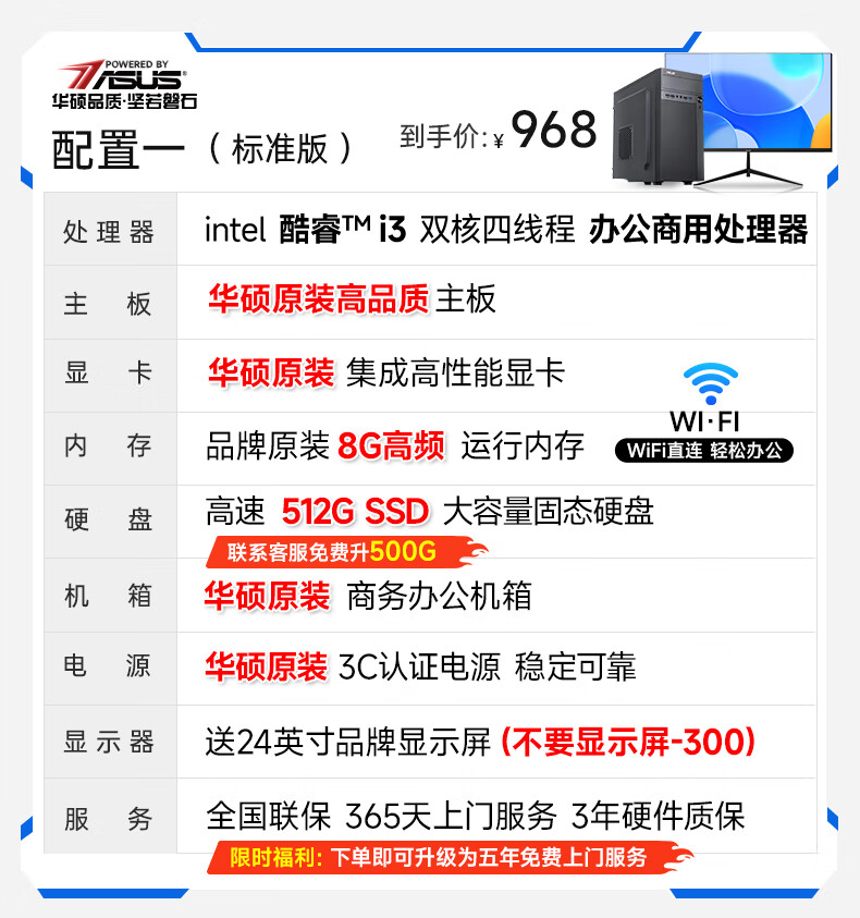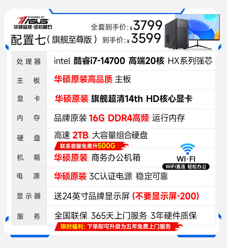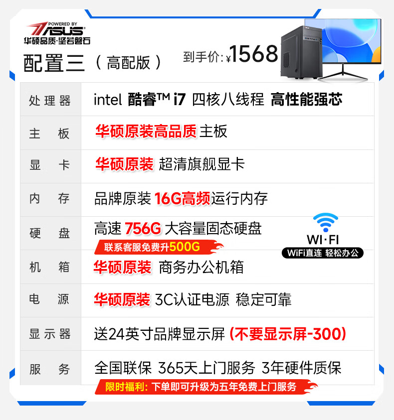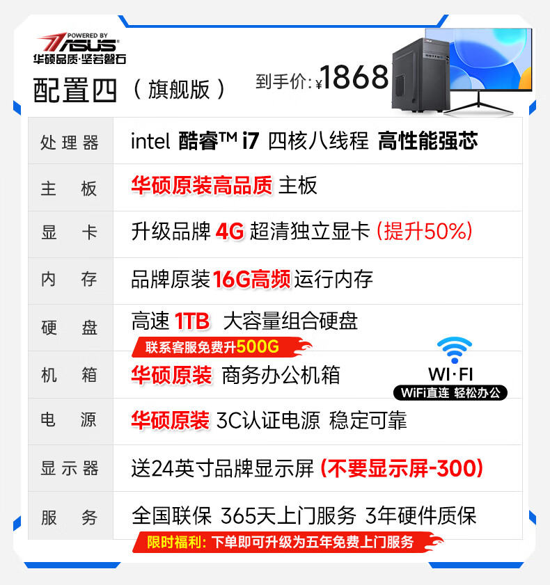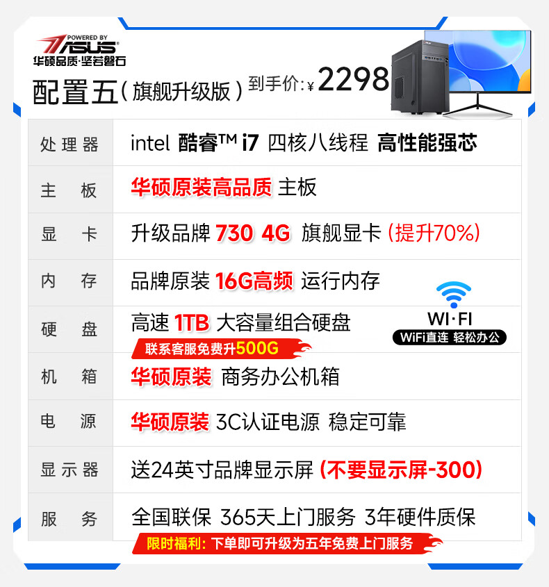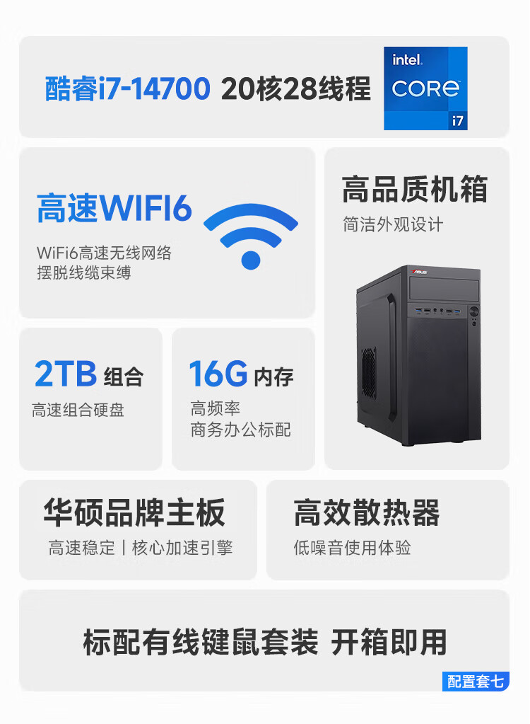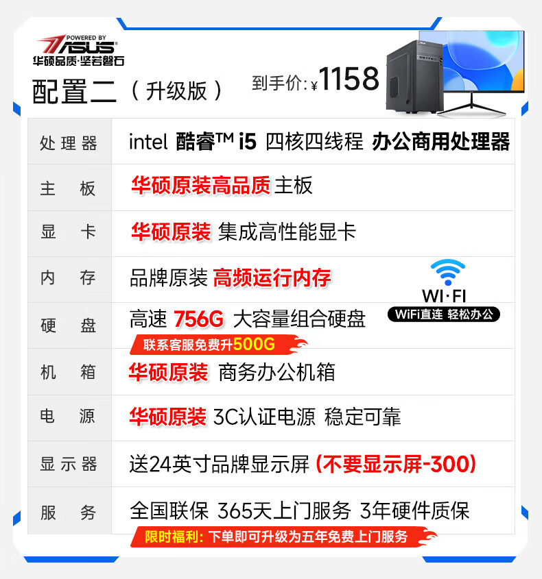 华硕(ASUS)【14代酷睿i7】台式电脑独显商务办公主机大额补贴家用游戏全套 华硕套二 酷睿i5/756G硬盘+旗舰核显 电脑主机+24寸显示屏全套【护眼】